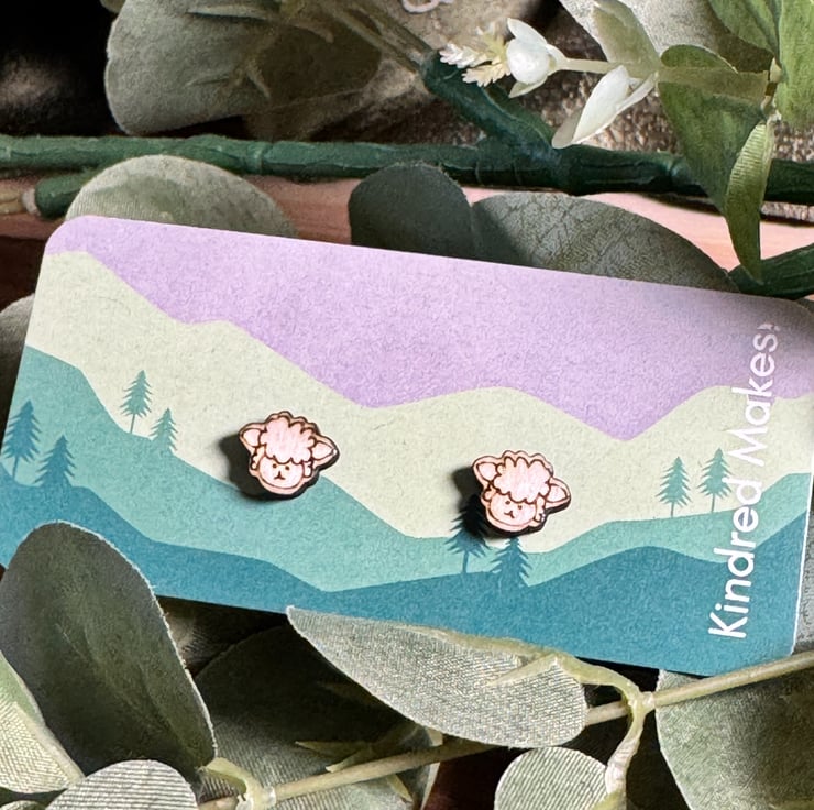 Show your love of the adorable fluffy sheep with these cute wooden stud earrings.