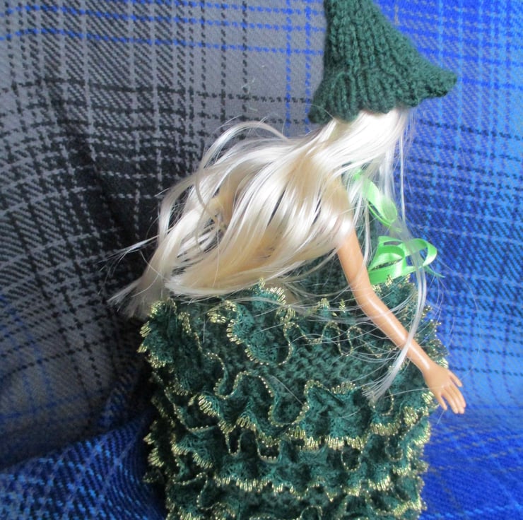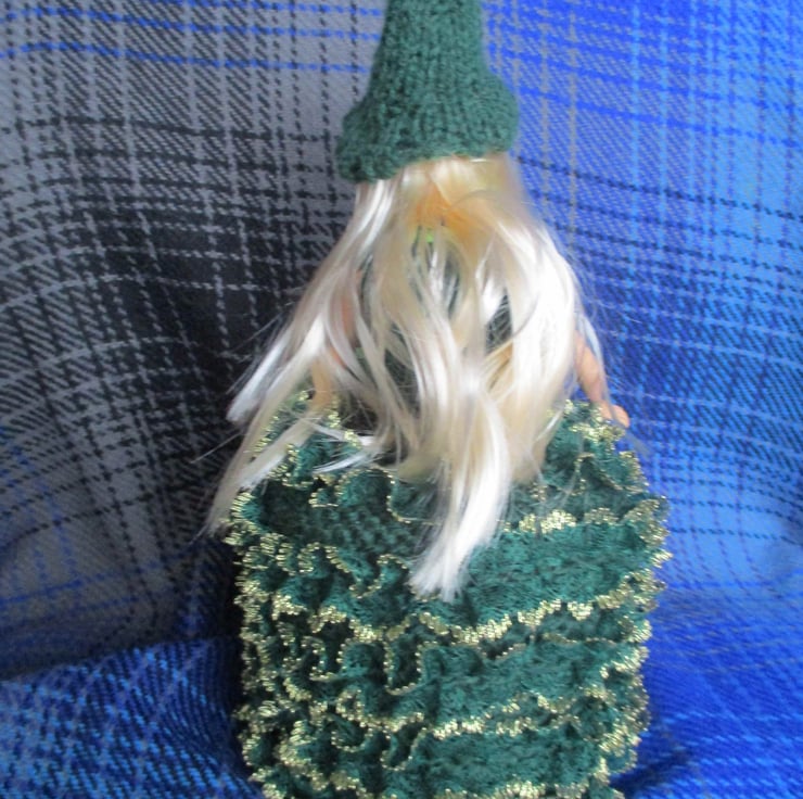 Each of my dolls are unique due to the variation in wool and ribbon colour. I hand knit these dolls dresses with double knitting wool and eyelet lace or other trimming. The dress has ribbon ties. Dolls arms and head move. Doll is made from a 12" fashion doll modified to 9" high. Dress fits over a standard toilet roll, doll fits into roll centre. The dress is removable for hand washing. Dresses are my own design. Packed in a white cardboard gift box and posted with a brown paper outer wrap. Carefully knitted in a smoke and pet free home.