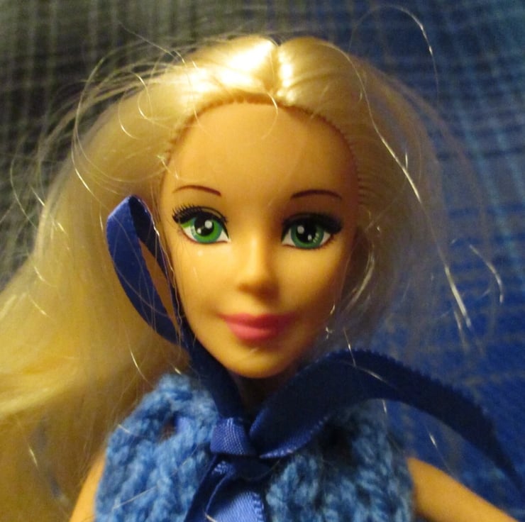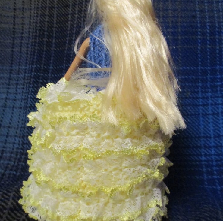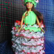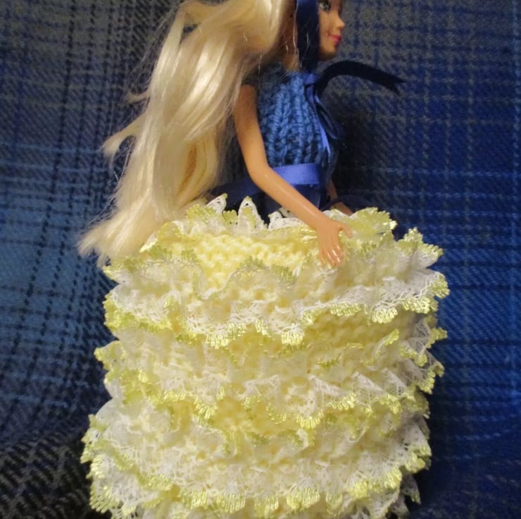 Each of my dolls are unique due to the variation in wool and ribbon colour. I hand knit these dolls dresses with double knitting wool and eyelet lace or other trimming. The dress has ribbon ties. Dolls arms and head move. Doll is made from a 12" fashion doll modified to 9" high. Dress fits over a standard toilet roll, doll fits into roll centre. The dress is removable for hand washing. Dresses are my own design. Packed in a white cardboard gift box and posted with a brown paper outer wrap. Carefully knitted in a smoke and pet free home.