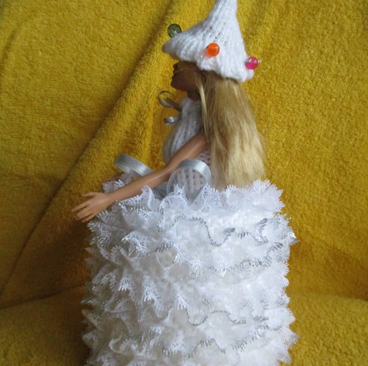 Hand Knitted White Christmas Tree Doll Spare Toilet Roll Cover