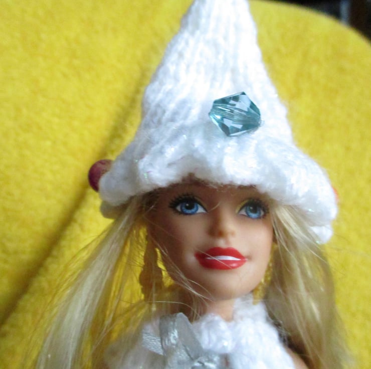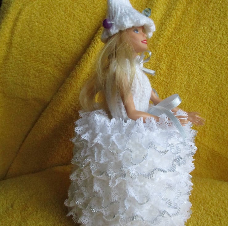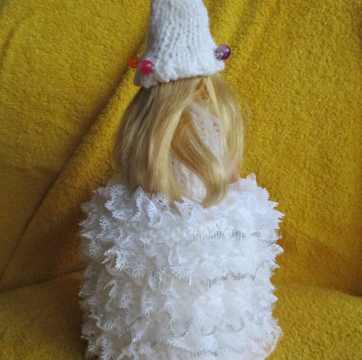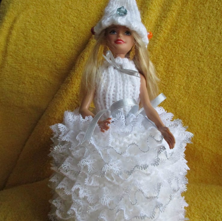 Each of my dolls are unique due to the variation in wool and ribbon colour. I hand knit these dolls dresses with double knitting wool and eyelet lace or other trimming. The dress has ribbon ties. Dolls arms and head move. Doll is made from a 12" fashion doll modified to 9" high. Dress fits over a standard toilet roll, doll fits into roll centre. The dress is removable for hand washing. Dresses are my own design. Packed in a white cardboard gift box and posted with a brown paper outer wrap. Carefully knitted in a smoke and pet free home.