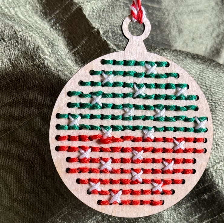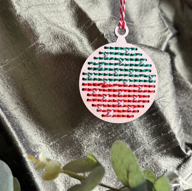 Each kit provides you with the bauble decoration, 3 coloured embroidery threads (in this pack there will be red, green and white threads), metal needle and a festive cotton twine to hang your decoration.