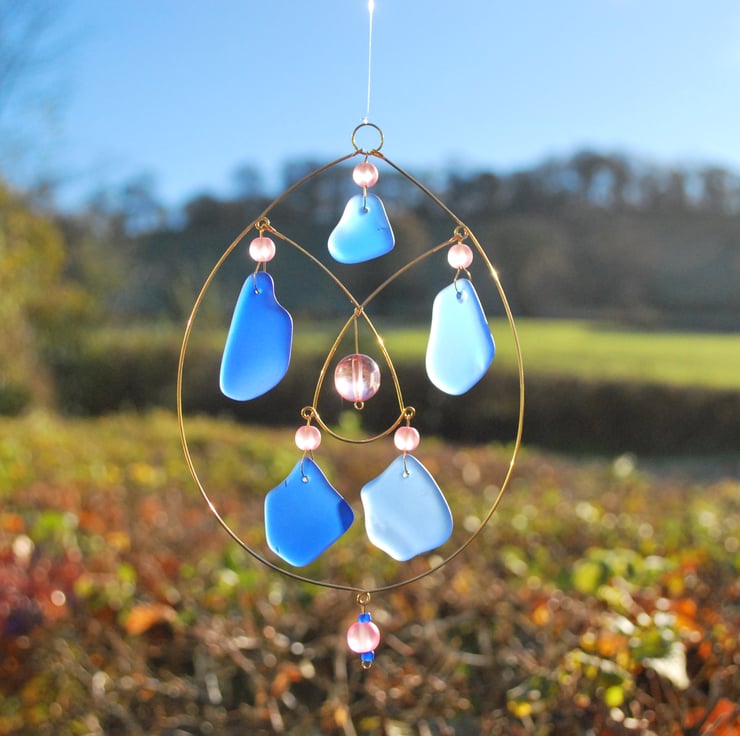 Our sun catchers are individually hand made in Chudleigh, Devon. We collect our materials ourselves, mainly from local beaches, including estuary beaches. Each piece of glass is unique, so each sun catcher is unique.