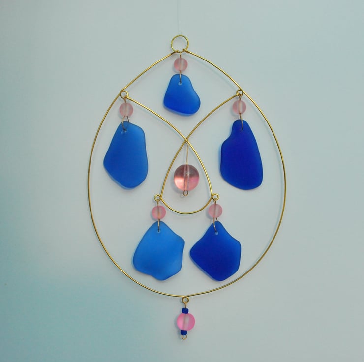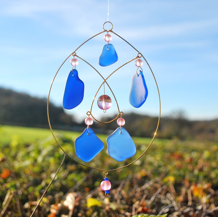 The blue glass we've used to make this gorgeous sun catcher has come from old poison or medicine bottles. The pieces of glass are all curved and come in two shades of blue. We've used peach glass beads to bring some additional colour and interest to the sun catcher.