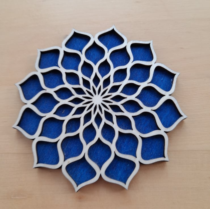A cut Mandala on a stained piece of birch ply giving a stylish look to your cuppa!