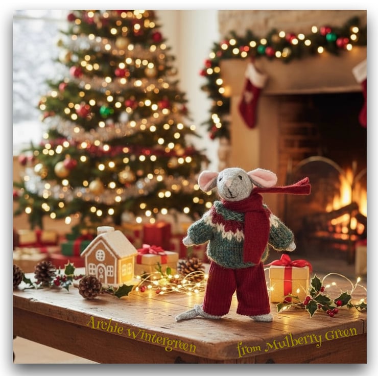 Archie Wintergreen, in his hazelnut brown corduroy trousers, Green, red and white yoked jumper and matching scarf, is a Little Nipper. Little Nippers are tiny wood mice who live in a maze of tunnels underneath the barn at Mulberry Farm. All of the Little Nippers are named after herbs and meadow flowers. Pip Squeaks are 11cm tall. Clothes made especially to fit them are also available in my shop.