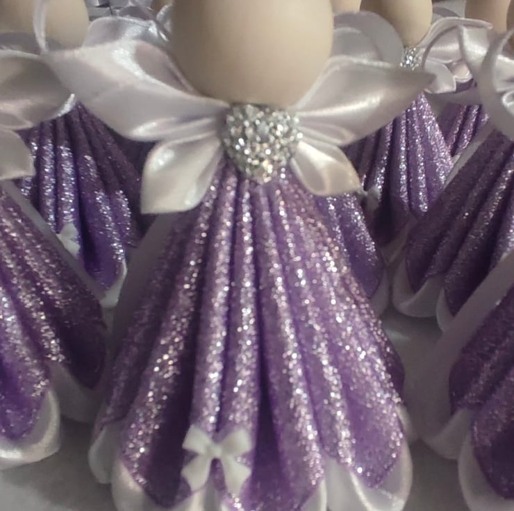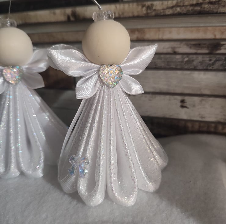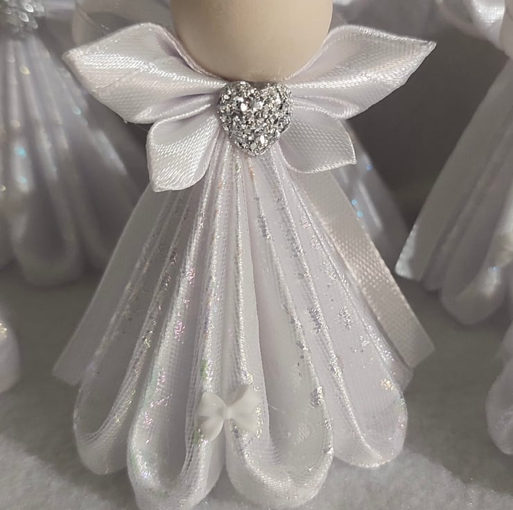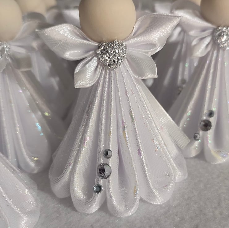 I offer handmade angel figurines made from satin ribbon. 4 £ each. The figurines are approximately 10 cm tall and have a base of approximately 6 cm. They stand alone and come with a hanger, allowing them to be hung, for example, on a Christmas tree. Available in 6 different colours. White, pink , cream, light and dark purple . Made with great precision and attention to detail. Packed in clear bag like on the last picture. Any questions please contact me.