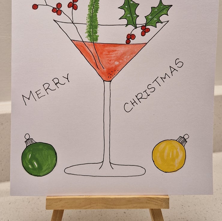 Cute handpainted watercolour of a cocktail gin glass with holly, mistletoe & Christmas baubles.