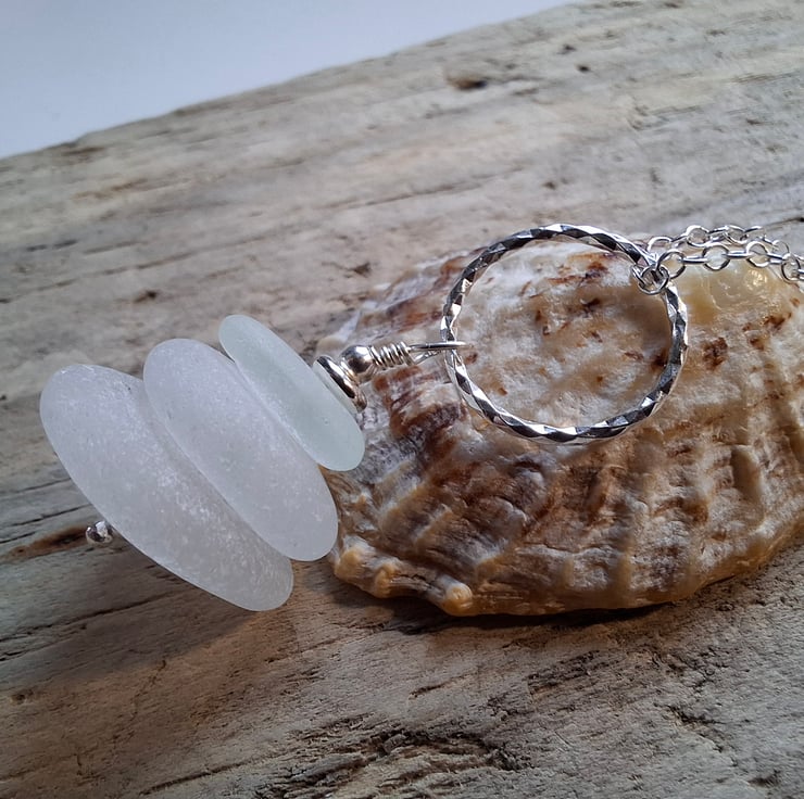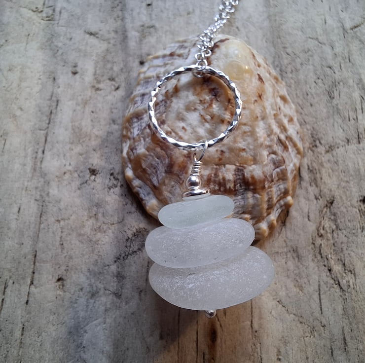 A beautiful sea glass stack made with white & seafoam frosted Cornish sea glass, on a 12mm diamond cut silver ring; these piece was found at Portreath.