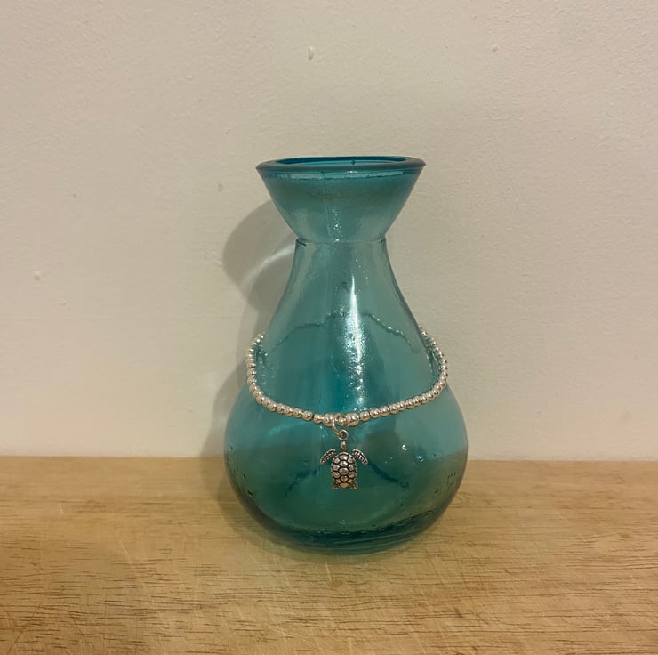 This is a hand threaded sterling silver bracelet with a sterling silver Turtle charm.