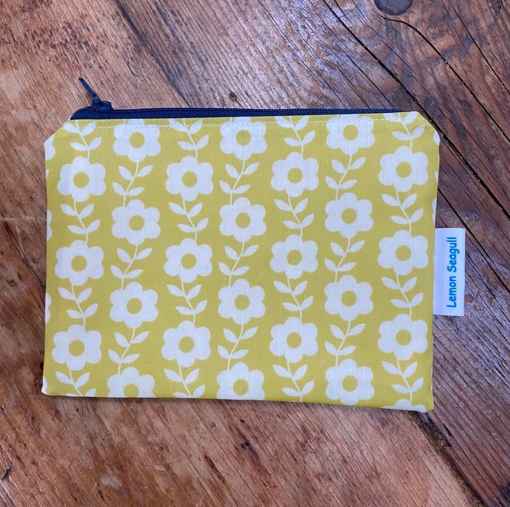 This make up bag is made from a yellow oil cloth with white flowers. The bag is lined with white cotton fabric and a blue zip.
