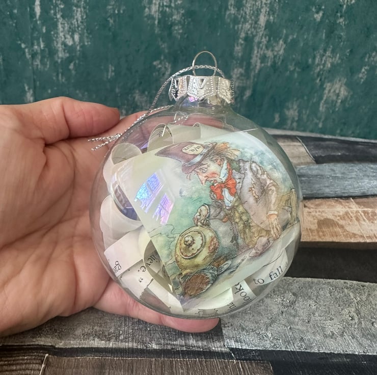 This bauble is filled with strips from an upcycled childrens book based on Alice in Wonderland book.