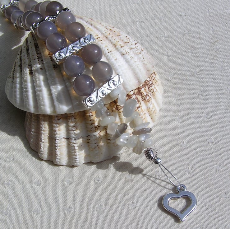 This Stunning Bracelet is made from Grey Agate round beads & contrasting Grey Moonstone Gem-Chips… each section separated by an ornately decorated Tibetan Silver Bar Spacer with a tiny Silver Heart at each end - a Beautiful Ethereal combination that will look stunning either worn casually or with something more Elegant for a Special Evening out