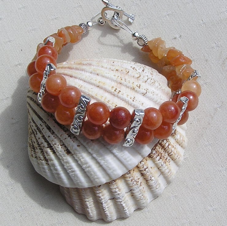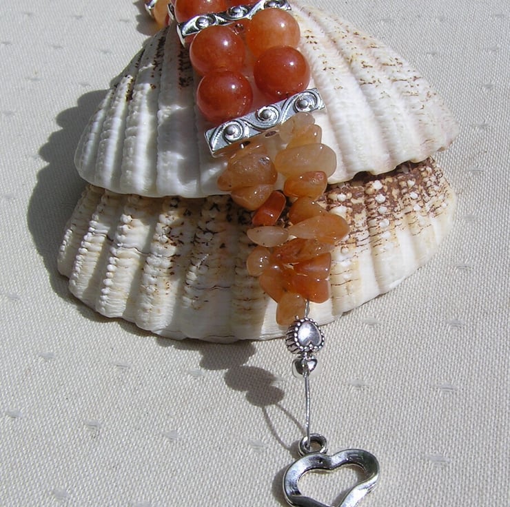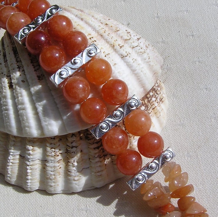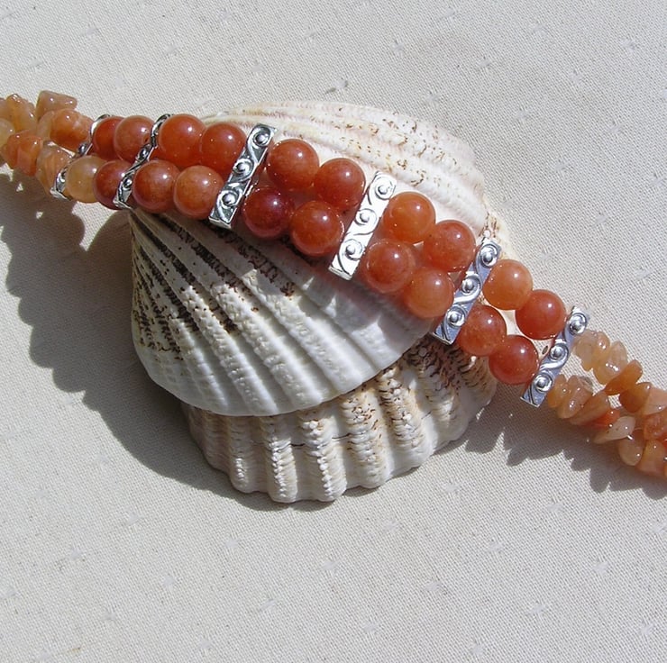 This Stunning Bracelet is made from Orange Sunstone round beads & contrasting Peach Aventurine Gem-Chips… each section separated by an ornately decorated Tibetan Silver Bar Spacer with a tiny Silver Heart at each end - a Beautiful Invigorating combination that will look stunning either worn casually or with something more Elegant for a Special Evening out