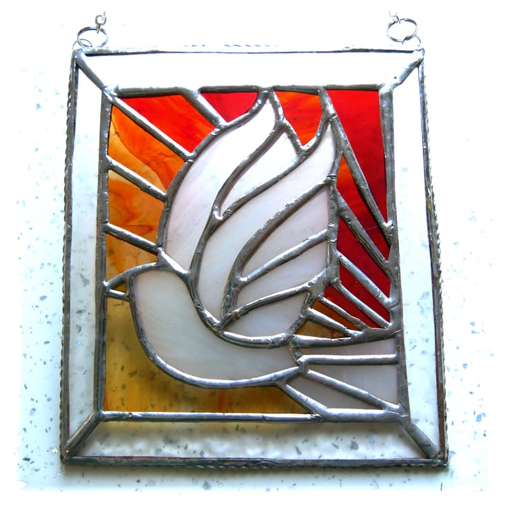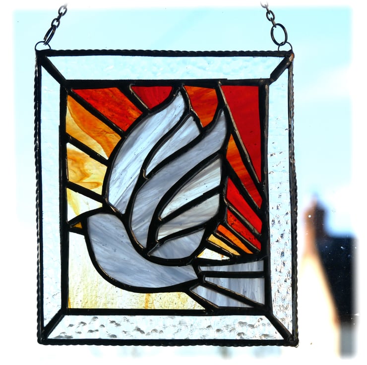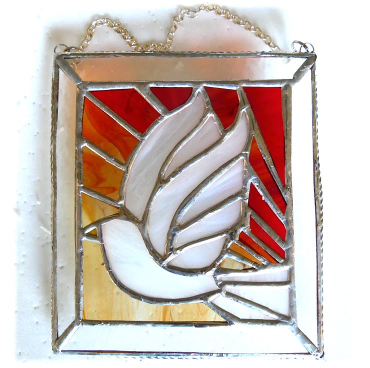 The rainbow rays are made from the 7 different shades of sunset coloured glass with lots of streaks for movement. This contrasts quite dramatically with the whiteness of the dove which is cut from streaky white glass. .