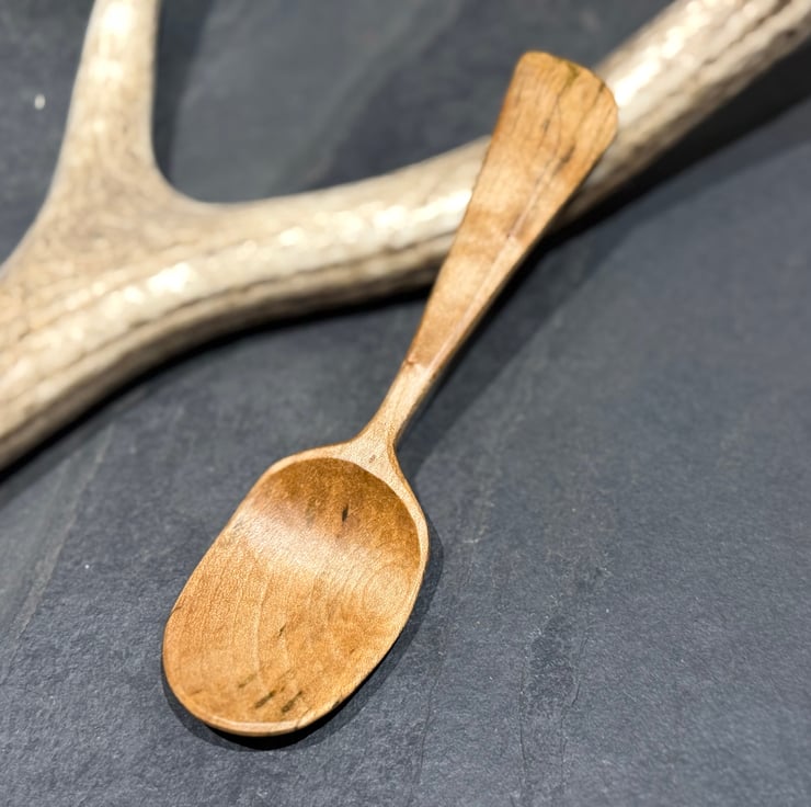 The spoon has been made from a freshly cut log, taken to its final shape using traditional methods- splitting the log firstly into a 'blank', drawing on a rough shape before axing out and then finalising the shape using an array of knives. This leaves beautiful cut facets which mean no sanding is required. After drying, the spoon receives a final shaping by knife. The spoon is then burnished using a smooth Scottish pebble leaving a silky feeling to the wood. Finally the wood is then sealed using organic food grade linseed oil.
