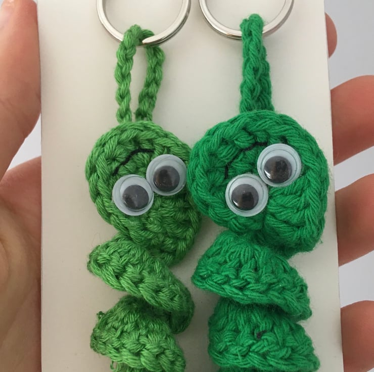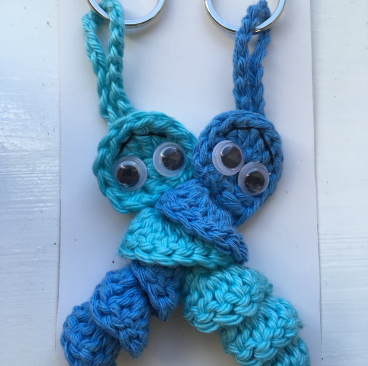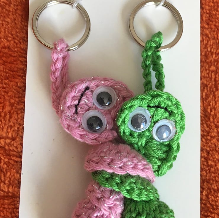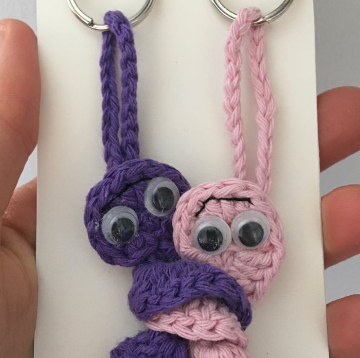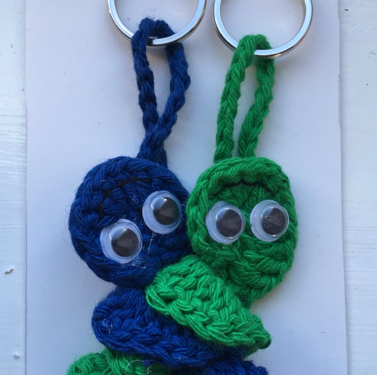 They are crochet and have googly eyes and a smiley face. Each one is attached to a keyring.