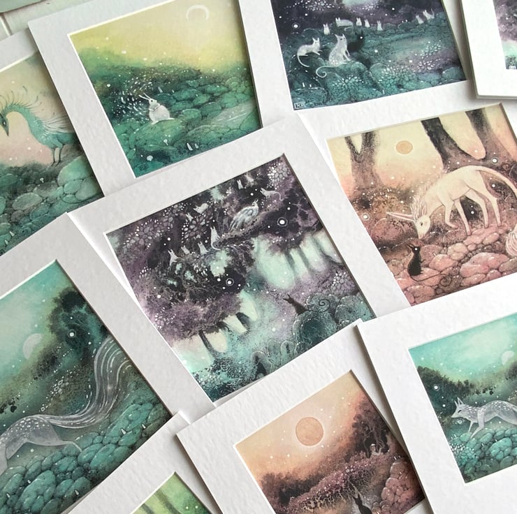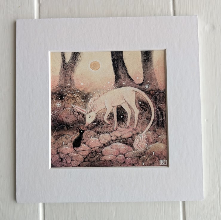 This piece was born from my own curiosity and from wondering what sort of unicorn might wander through my dreamworld. I never quite know what these beings look like until they reveal themselves during the painting process, and I was genuinely charmed by him as he appeared. He isn’t regal or majestic. Instead, he has a quiet innocence that makes me smile. I hope he brings a little light to your day as well :