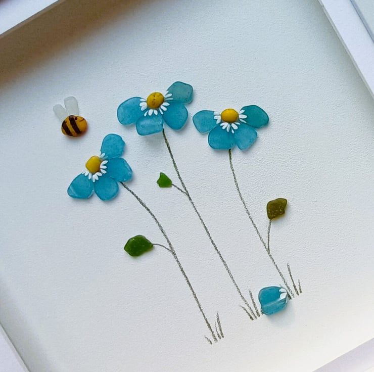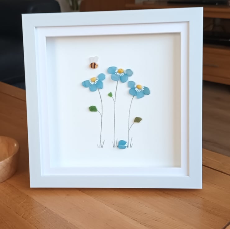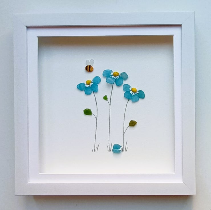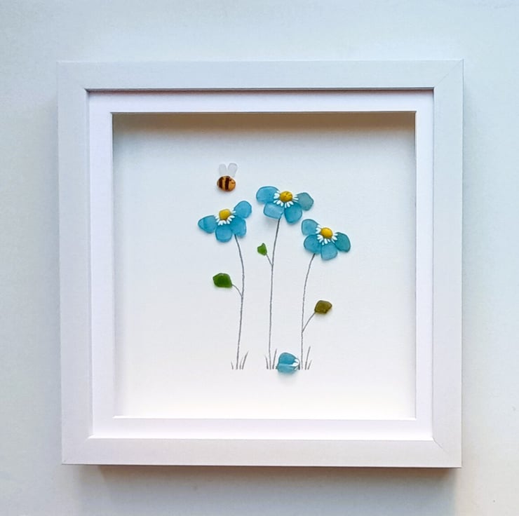 These forget me not flowers have been made from little nuggets of perfectly petal shaped Cornish sea glass, coloured blue by me, and set inside a 29cm square glazed box frame.