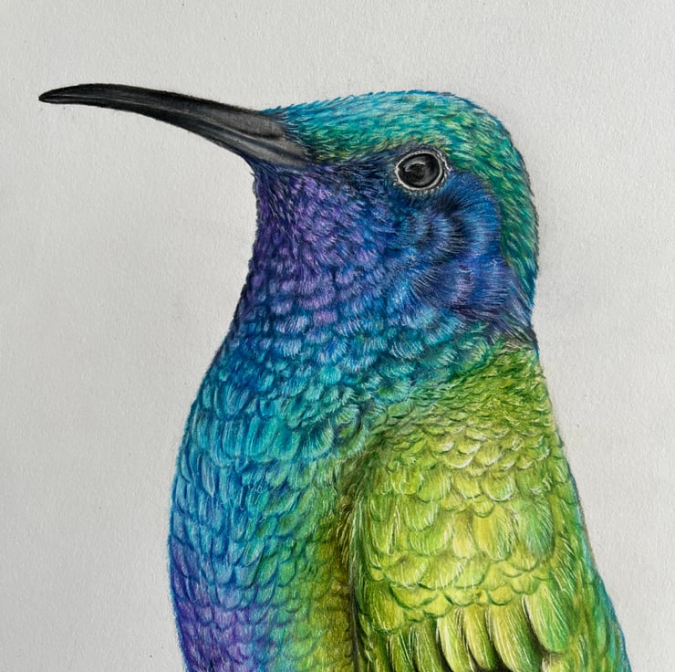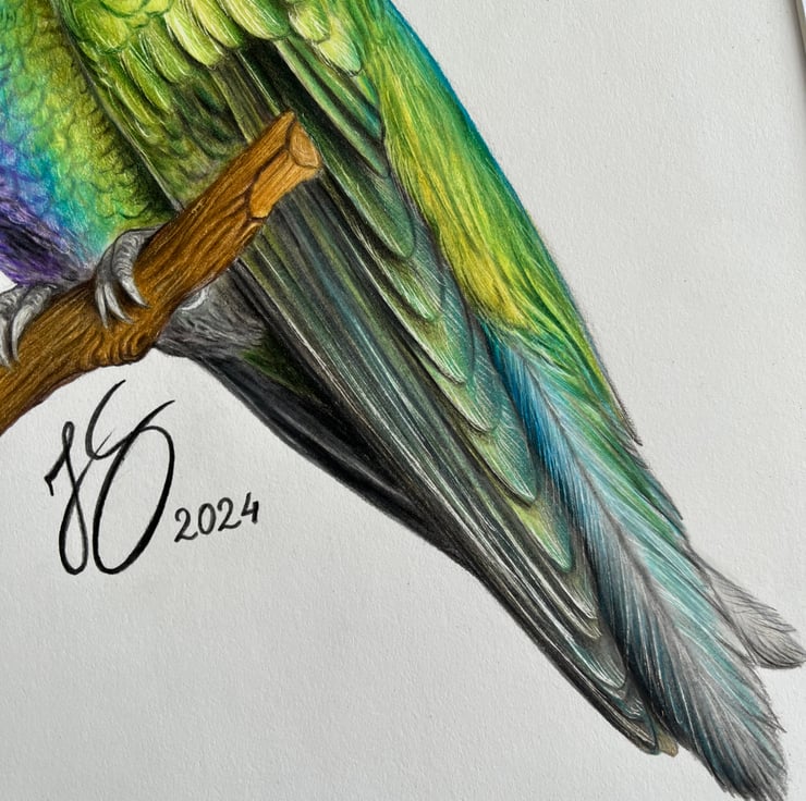 A coloured drawing of a hummingbird perched on a small branch. Signed and dated.