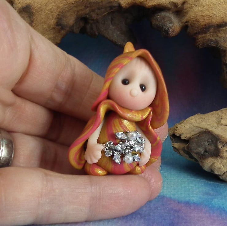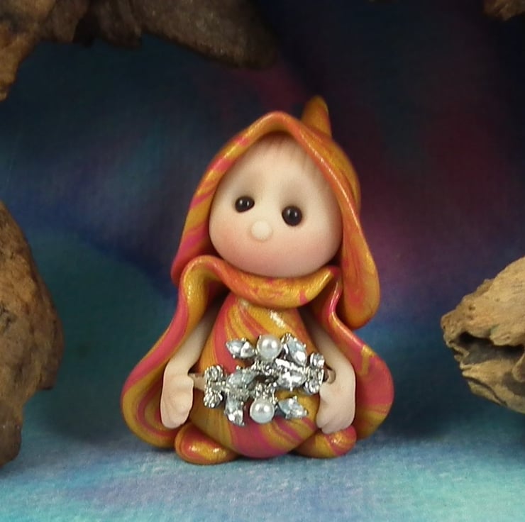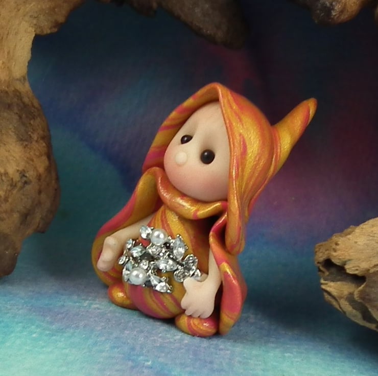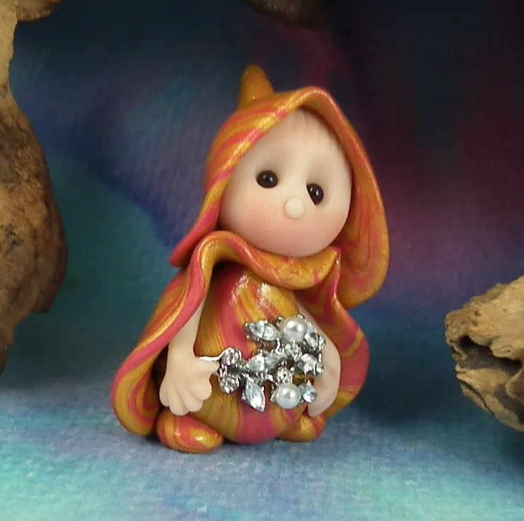 This is a 'one of a kind' creation having been entirely handmade without the use of moulds here at my studio on the Sussex Coast. Modelled with artist blend polymers, blushed before sealing with lacquer, Thea has sparkling black onyx eyes and vivid robes. Thea the Magical Gnome is just one and a half inches tall.