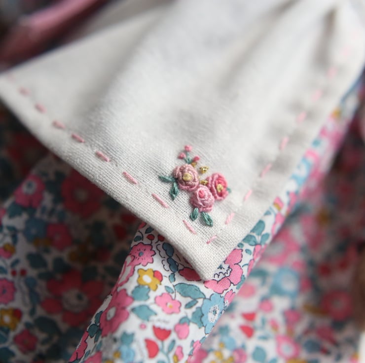 She is wearing a removeable dress made from beautiful Liberty of London fabric in Betsy Ann dark pink with a little Peter Pan collar.