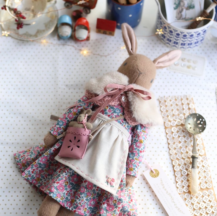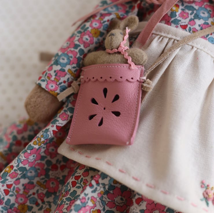Her accessories include a tiny leather bag, hand punched with a daisy design and containing a baby bunny with a ric rac tie.