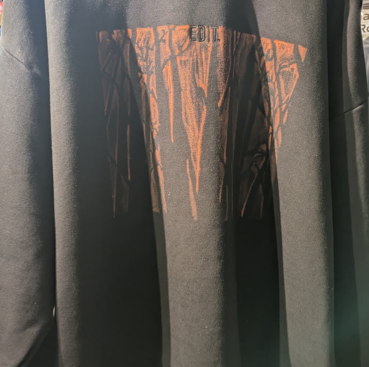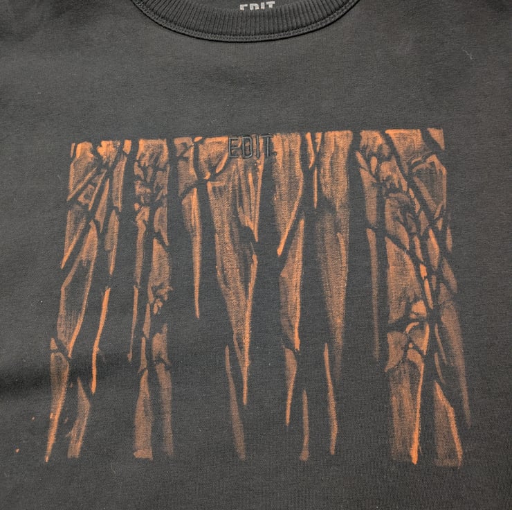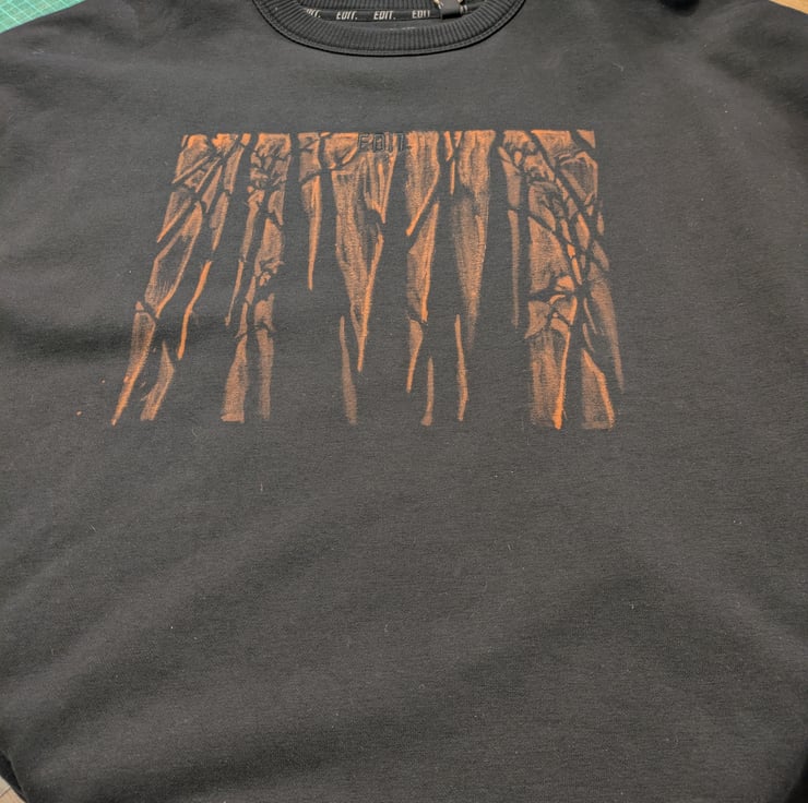 The design on the front has been hand painted using bleach. The tall trees depicted give an air of mystery.