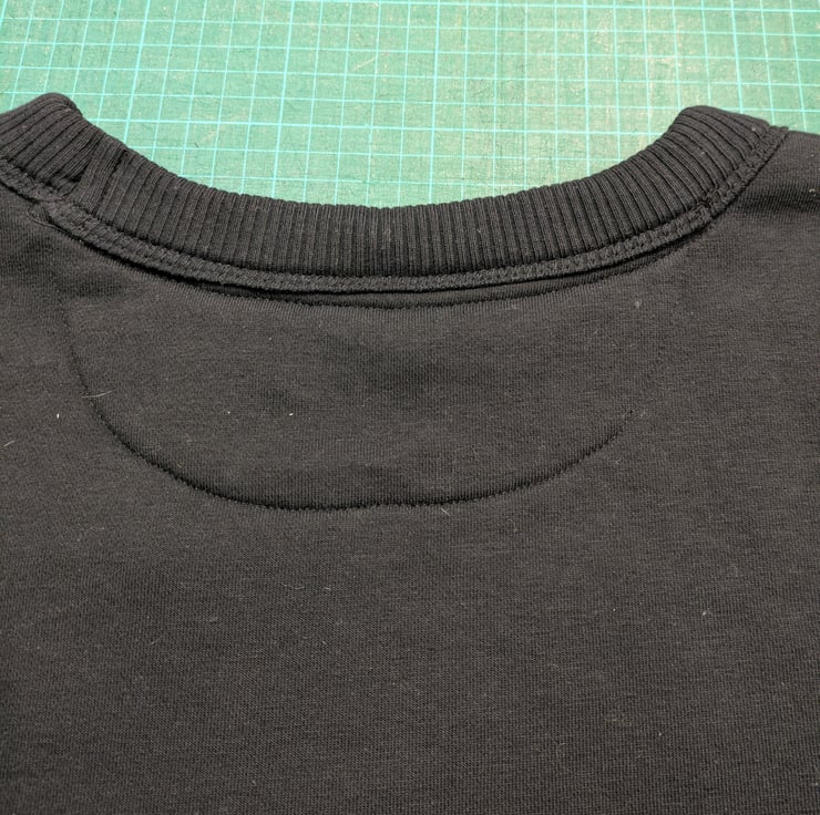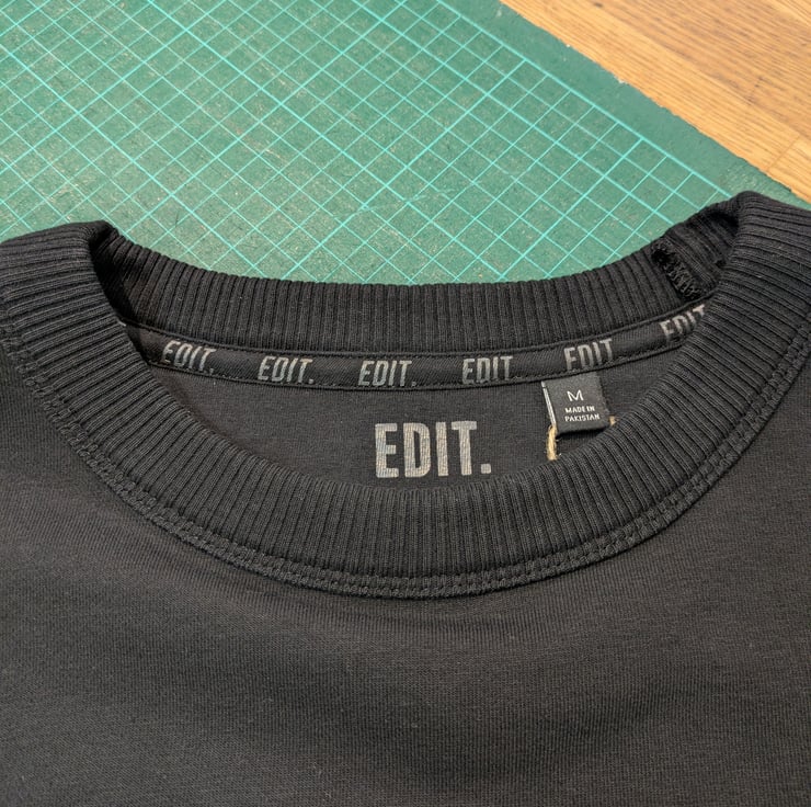 This black sweatshirt is a size medium, chest size 39-41 inches. It has a comfortable elasticated round neck and cuffs with a loose fitting bottom trim.