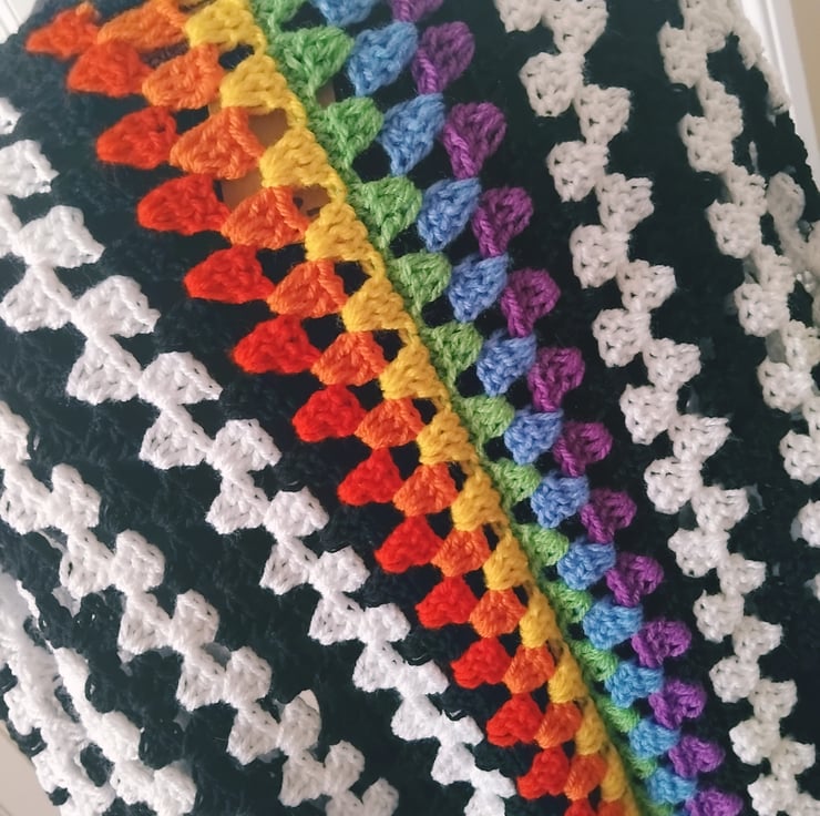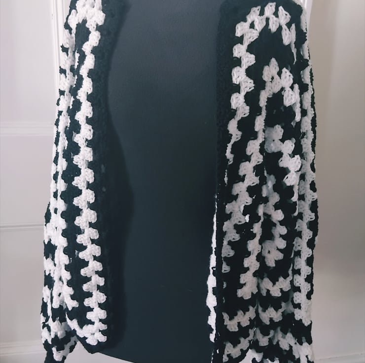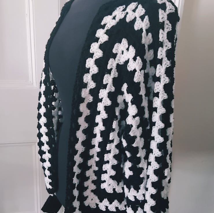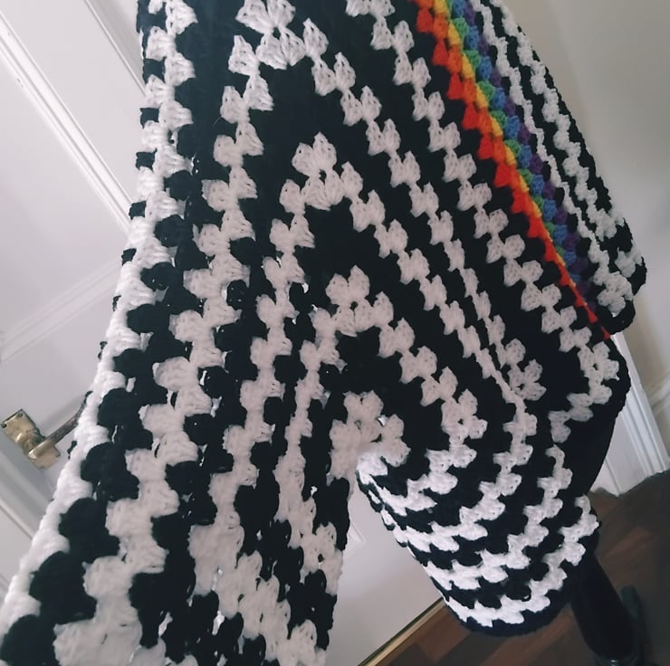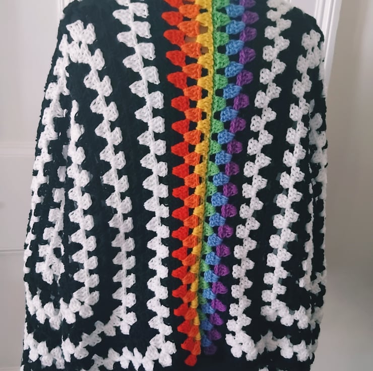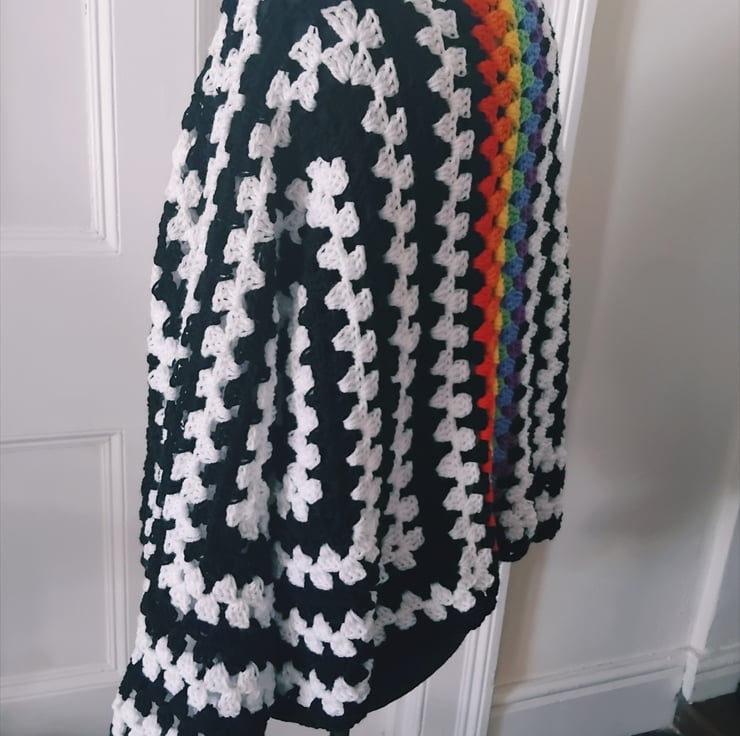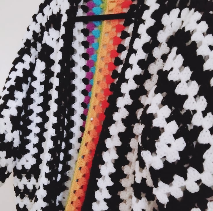Crochet hexagon cardigan in black and white with a gorgeous rainbow stripe across the back.
