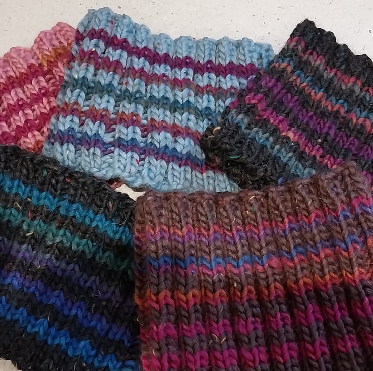 Their construction is a a simple double rib which gives a flexible sizing. They are all made on the round which means there are no seams and they are very soft to the skin due to the single ply chunky merino content.