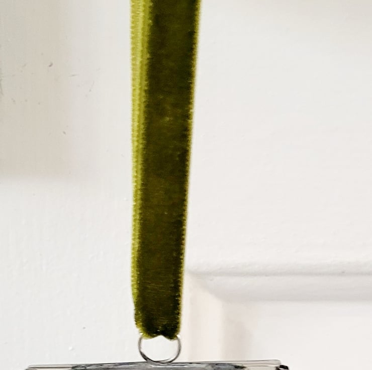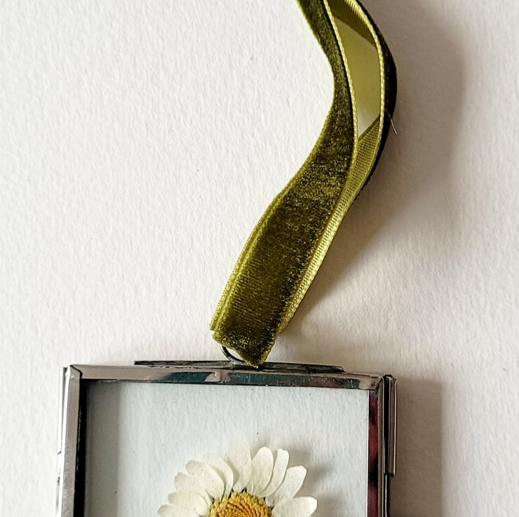 Materials: Metal frame and clasp, glass, pressed daisy and green velvet ribbon.
