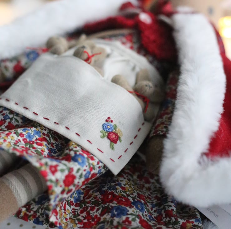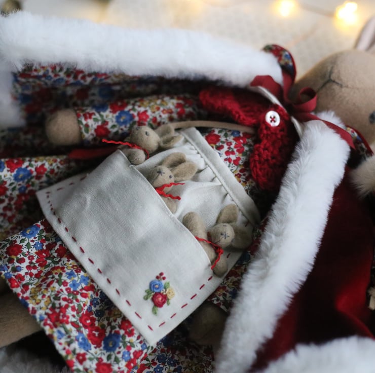 Her apron is made from cotton/linen fabric and embroidered with tiny running stitches and a little sprig of flowers and has space for 3 baby bunnies.