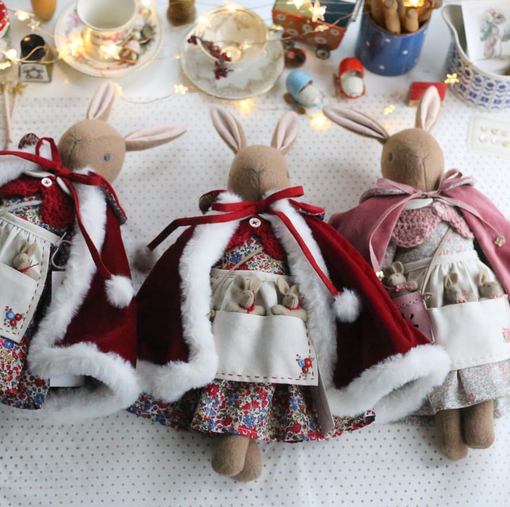 This listing is for 1 heirloom Christmas bunny with a fur trimmed red velvet cape, handmade in the U.K. by Katy Livings.