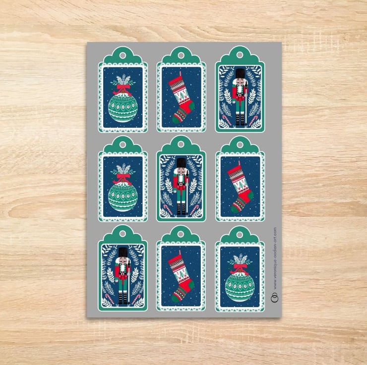 Add a touch of elegance to your gifts this Christmas with this set of unique gift tag designs featuring a nutcracker, Christmas stocking and bauble, sold as a sheet of 9 tags sent as a PDF file.