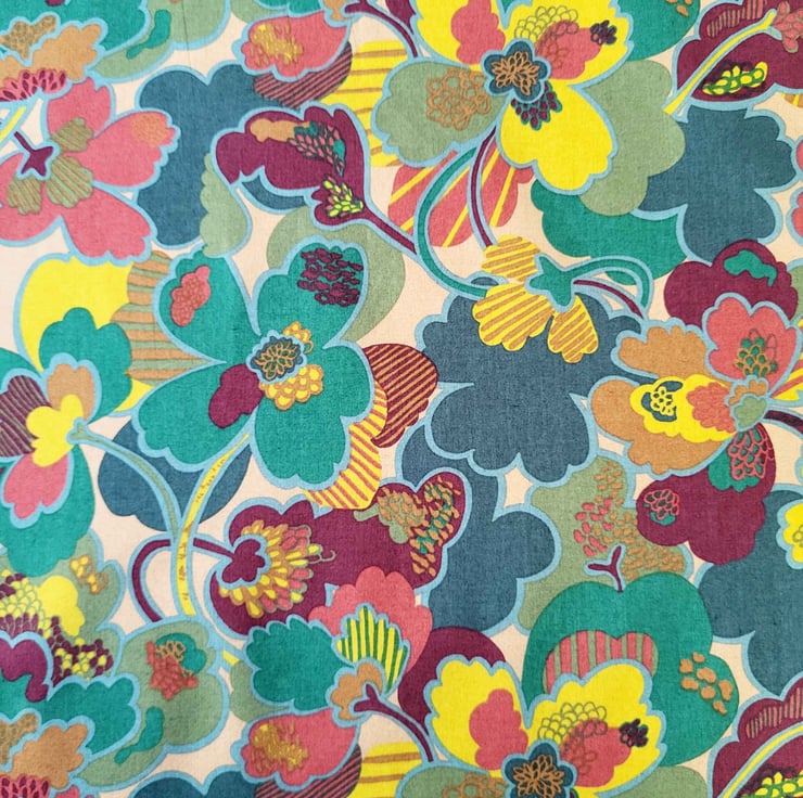 The Prospect Flower C print is inspired by the 1960s Art Nouveau revival and is infused with vibrant retro vibes. Its prominent petals have bold outlines and are filled with flat colour, detailed curves, stripes, scribbles, and dashes.