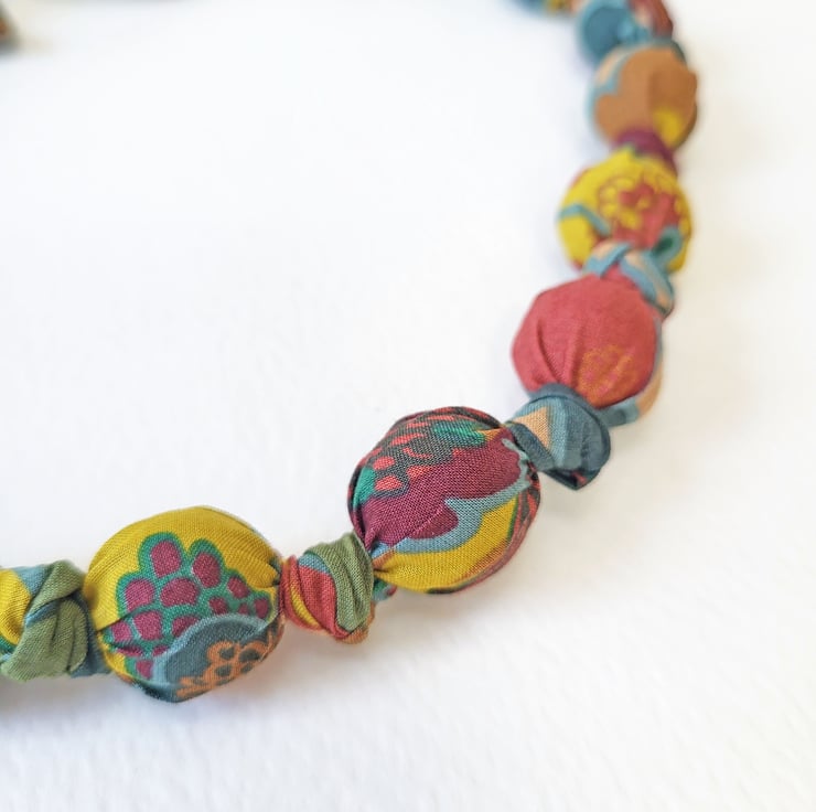 Green, Brown, Maroon & Mustard Liberty Print Fabric Necklace - Prospect Flower C