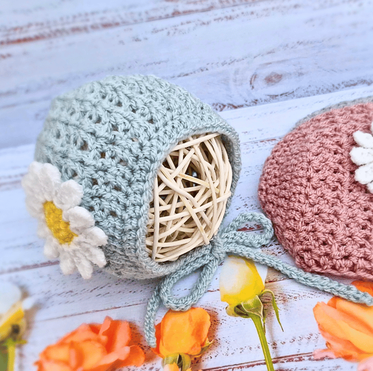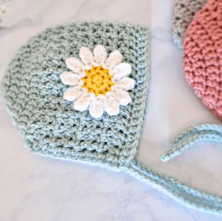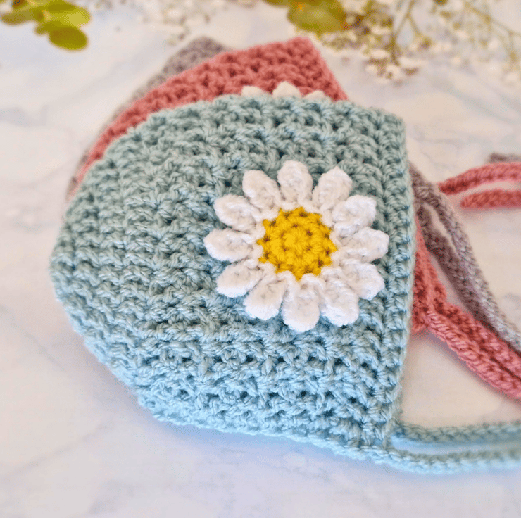 - Handmade crochet bonnet with delicate white daisy and cheerful yellow centre