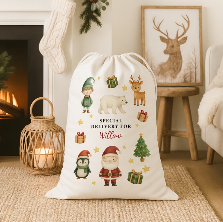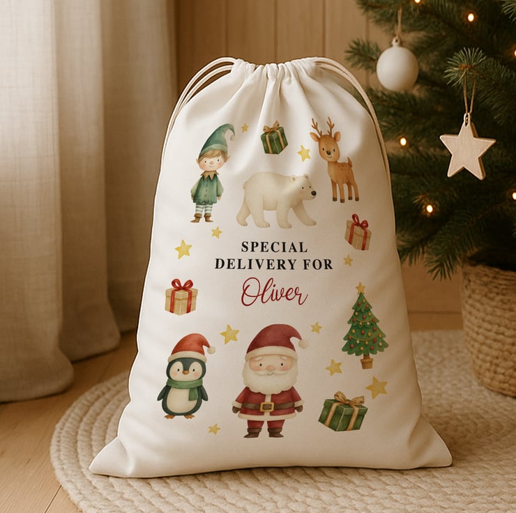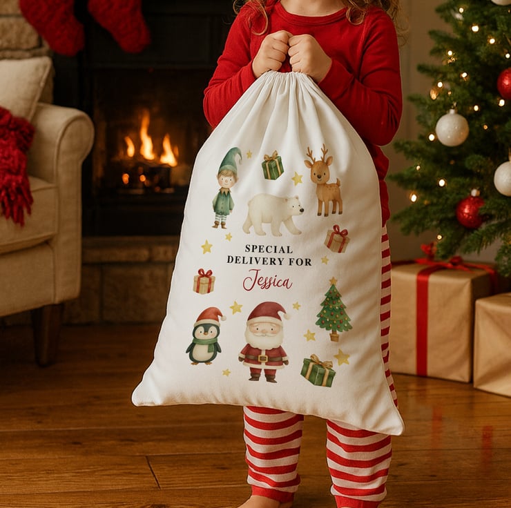 Make Christmas morning extra magical with this adorable Festive Friends Santa Sack, featuring charming illustrations of Santa, an elf, a penguin, a polar bear, and a reindeer. Designed to delight children and create excitement on Christmas Eve, this large present sack is personalised with any name up to 9 characters for an unforgettable festive surprise.