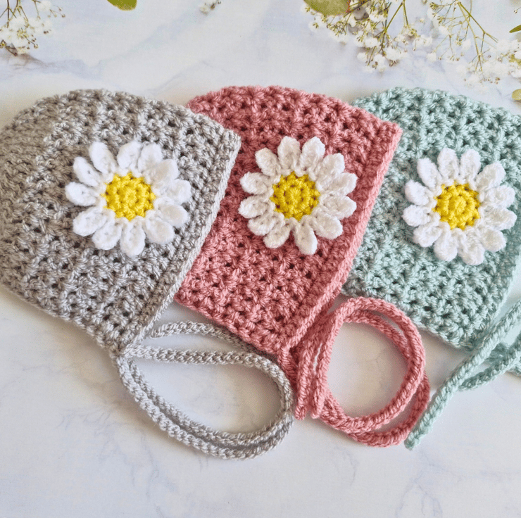 - Lovingly crocheted bonnet featuring a soft white daisy with a sunny yellow centre