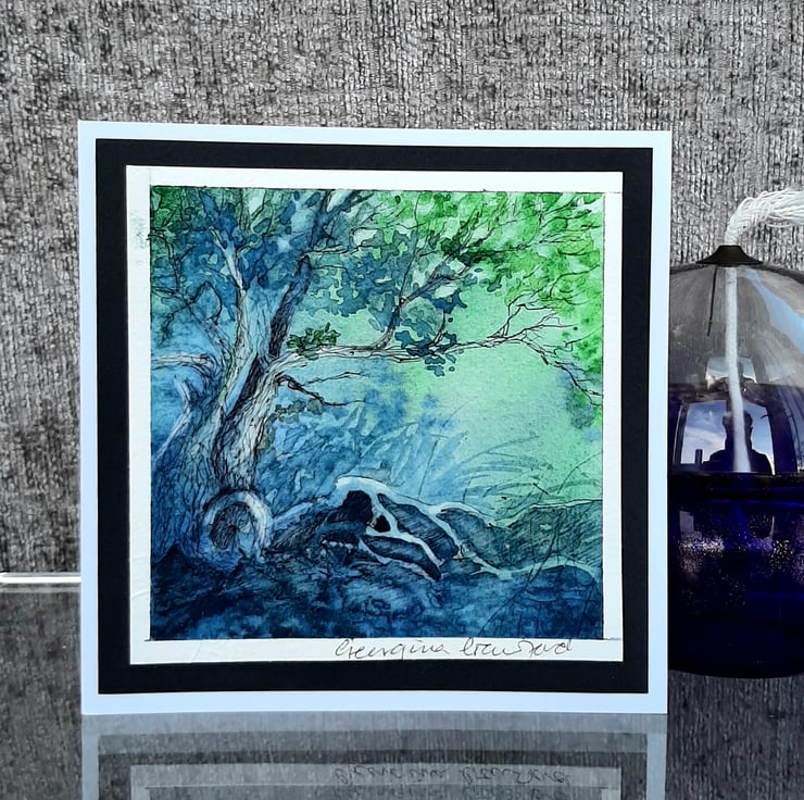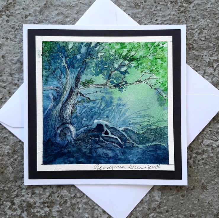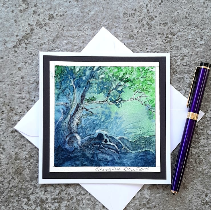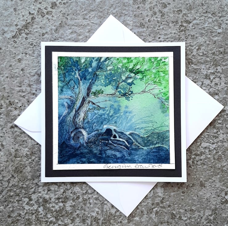 A beautiful watercolour painting of forest light made into a card and ideal to send as a gift for framing. There's plenty of space for you to write your message inside.