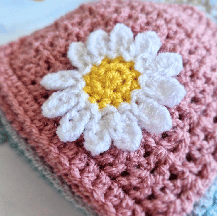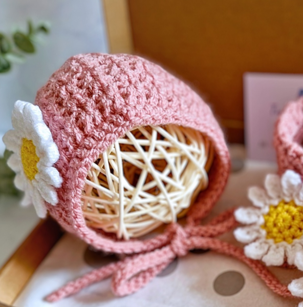 - Soft crochet bonnet finished with a white daisy and gentle yellow centre