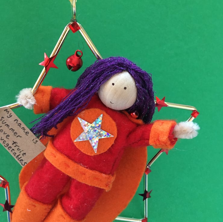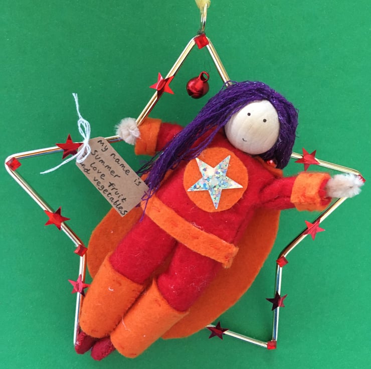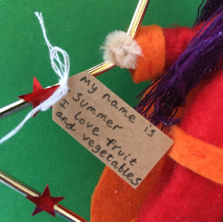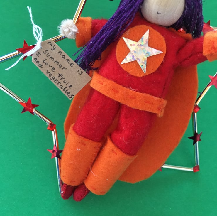 She has a tag with her name on and something that she loves. This superhero is called Summer, and she loves fruit and vegetables.