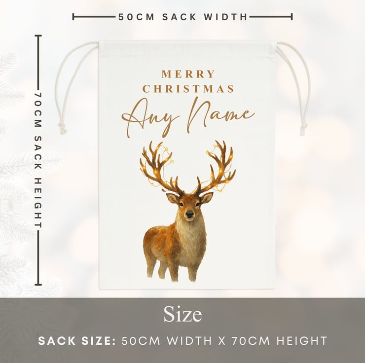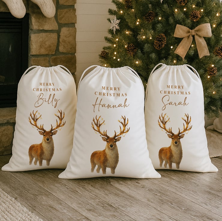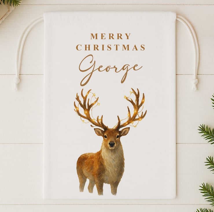 This elegant Watercolour Reindeer Christmas Sack is perfect for families who love a cosy, natural and rustic festive style. Featuring a beautifully painted reindeer with warm, woodland tones, it brings a touch of sophistication to any Christmas setting. Personalise with any name up to 9 characters to create a timeless, personalised festive keepsake.