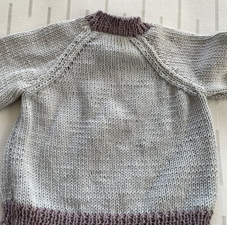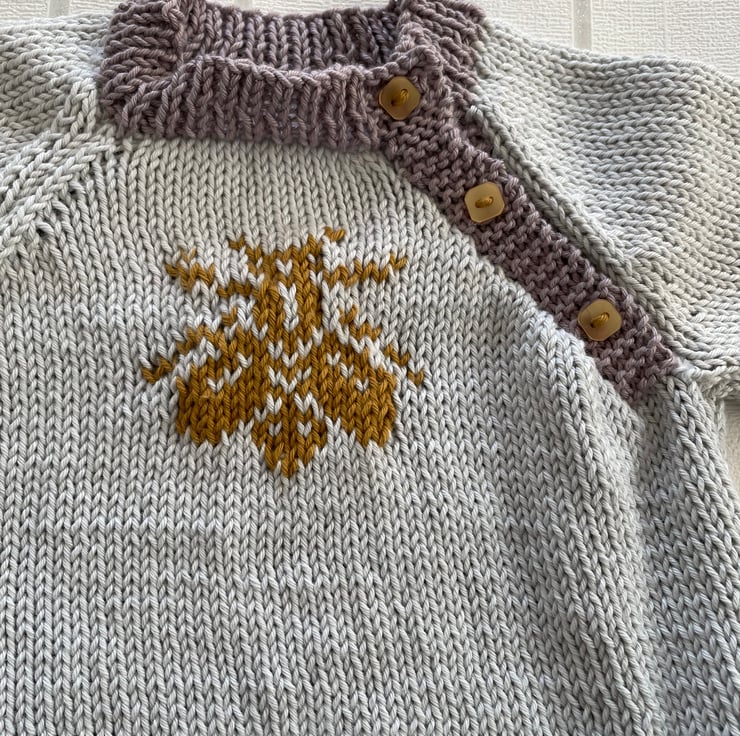 It fastens on the front raglan shaping with matching buttons making it easier to put over the baby’s head.