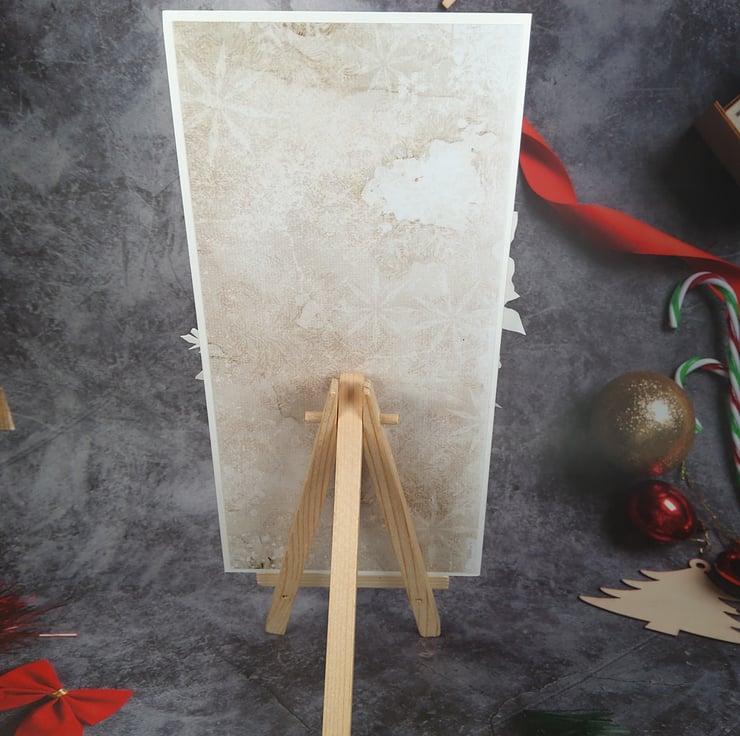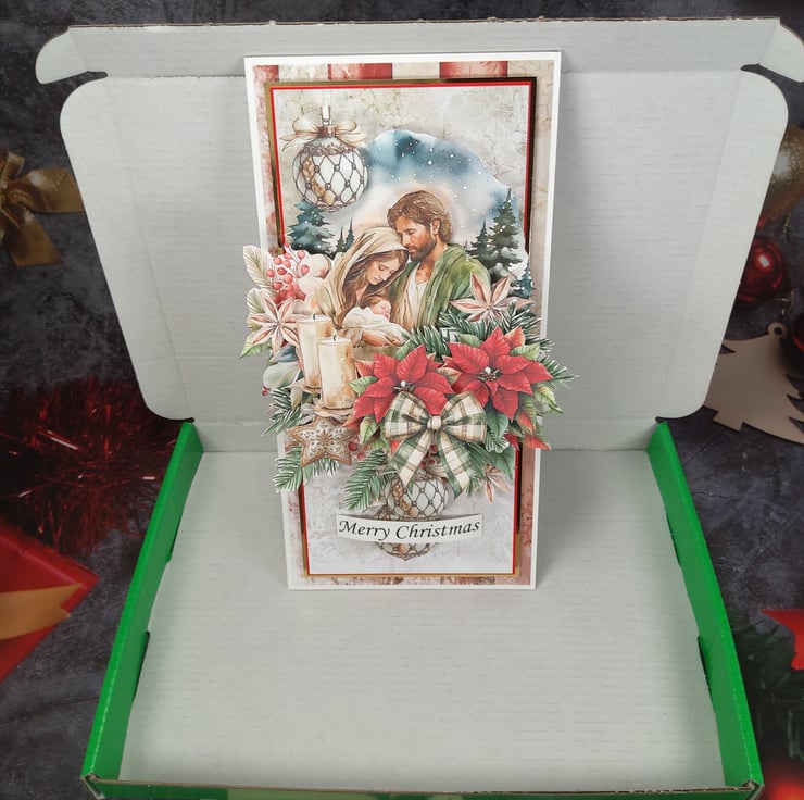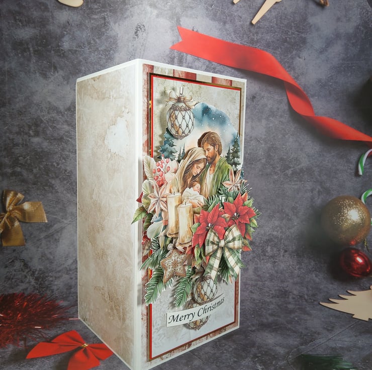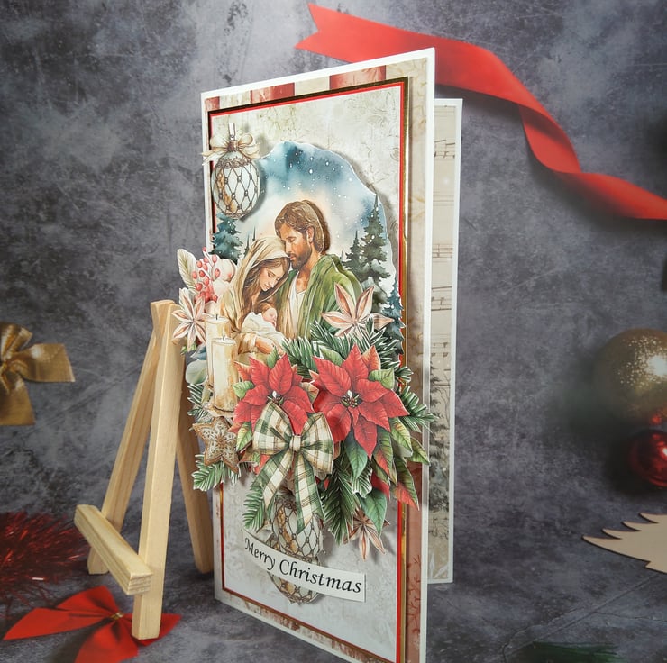 A beautifully handcrafted Christmas card featuring the Holy Family, surrounded by elegant festive elements such as poinsettias, candles, winter greenery and a vintage-style bauble. The layered 3D composition adds depth and warmth, making this piece perfect not only as a card but also as a charming seasonal decoration to display during the holidays.