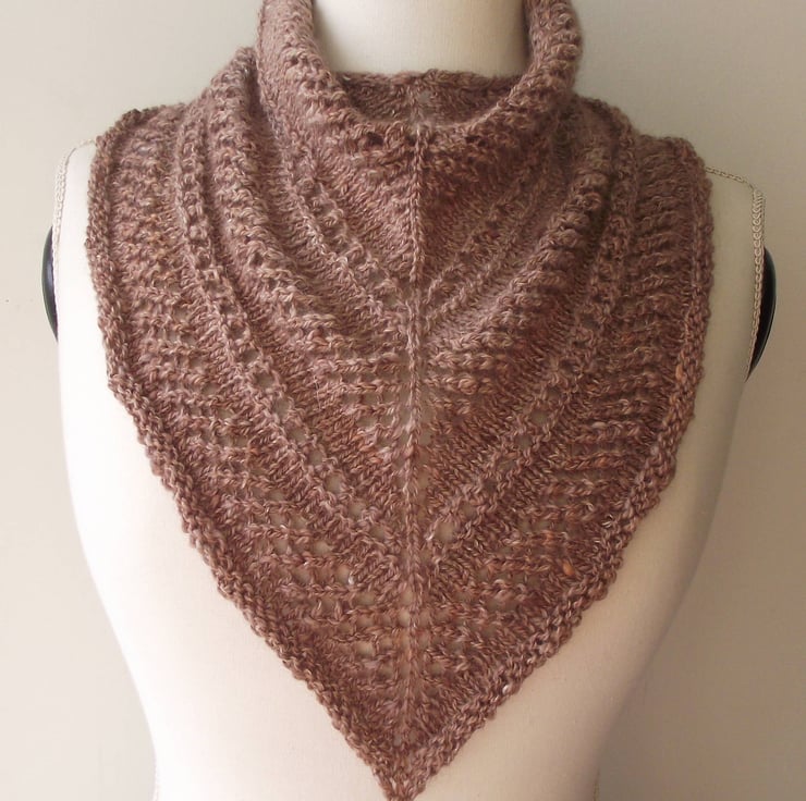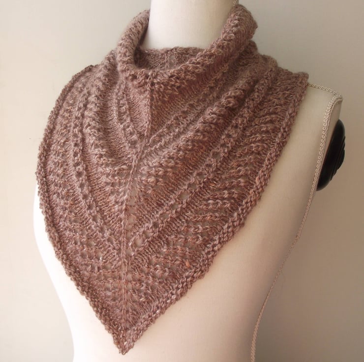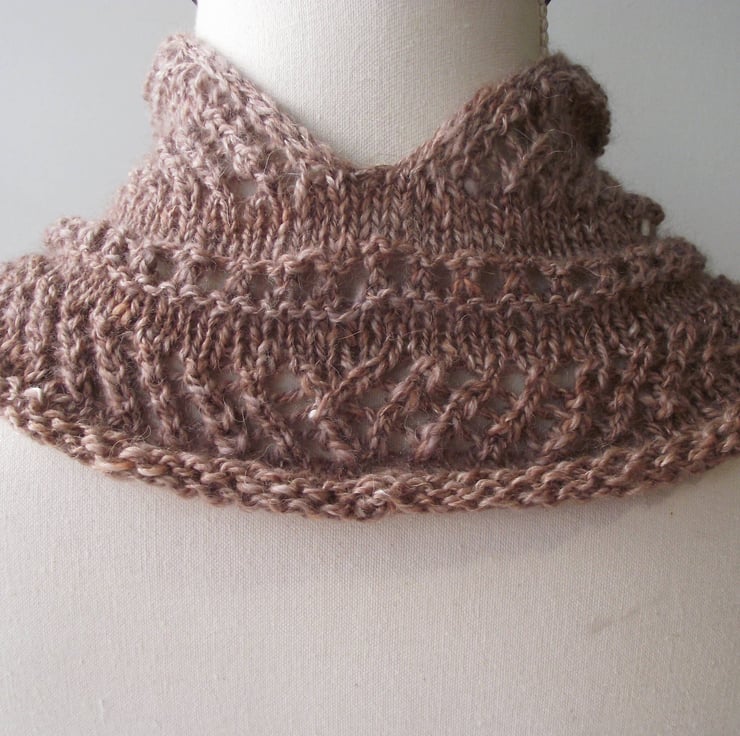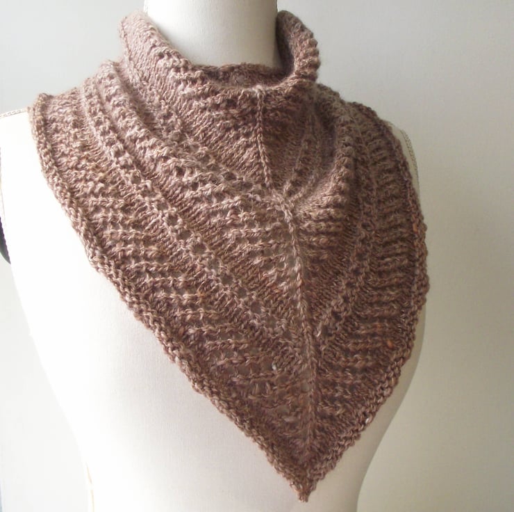 I blended merino wool in shades of fawn, milk chocolate and peach together with some mulberry silk and then handspun this blend into a lightweight yarn. I then knitted this kerchief cowl (my own design) using bands of stocking stitch, eyelets and trellis stitch.