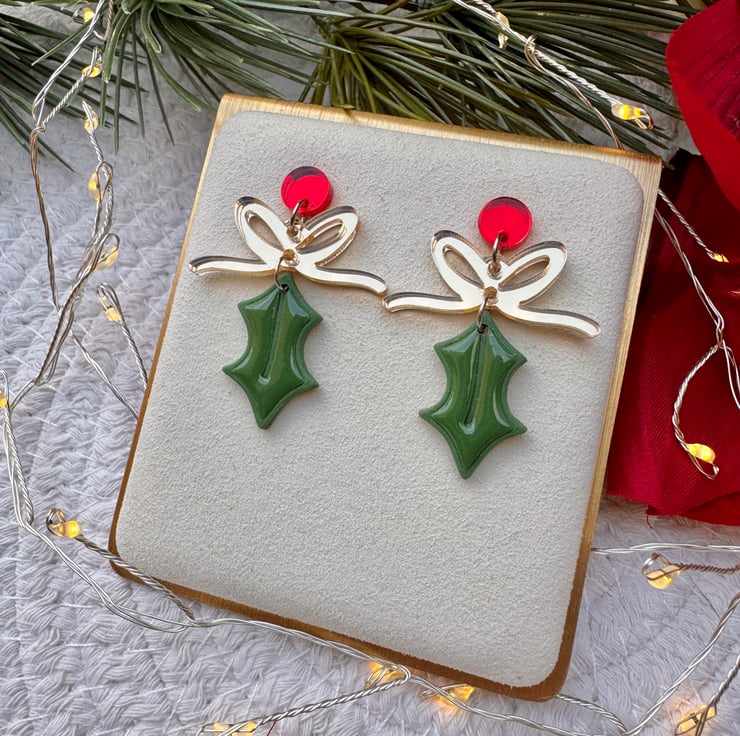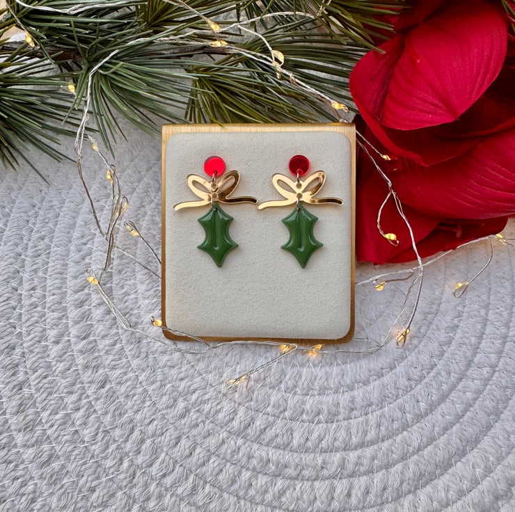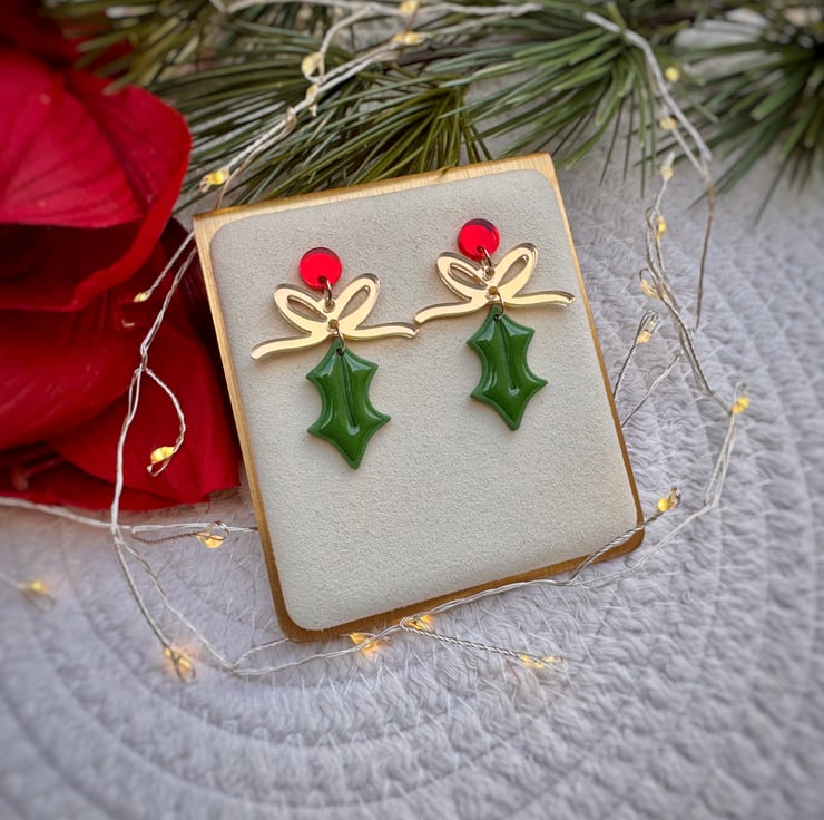 With a Red Berry Circle stud top and descending drop of a mirrored acrylic gold bow; and