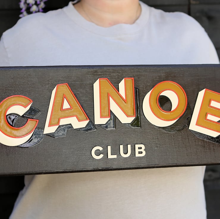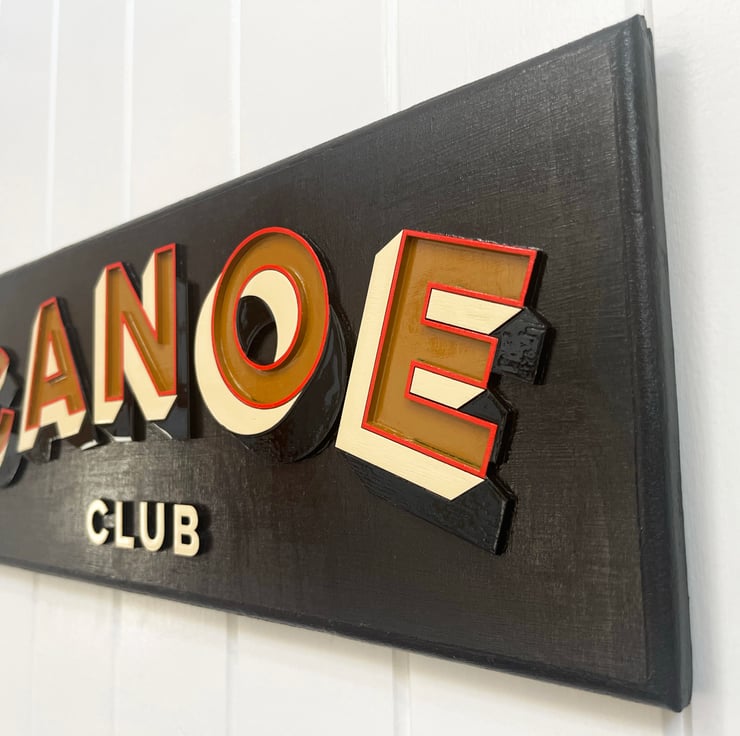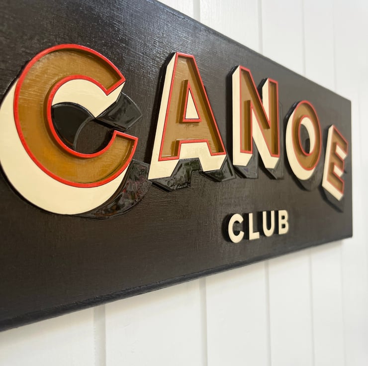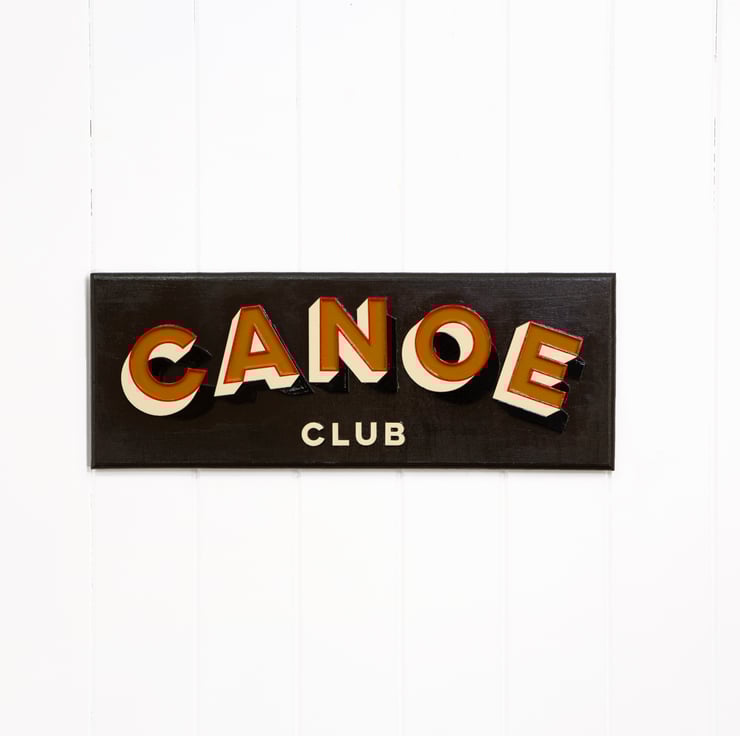 Bring a touch of vintage adventure to your walls with this hand-painted Canoe Club sign. Each letter is individually cut from wood and layered for a bold 3D effect, and finished with traditional signwriting paints for a crisp, glossy look.