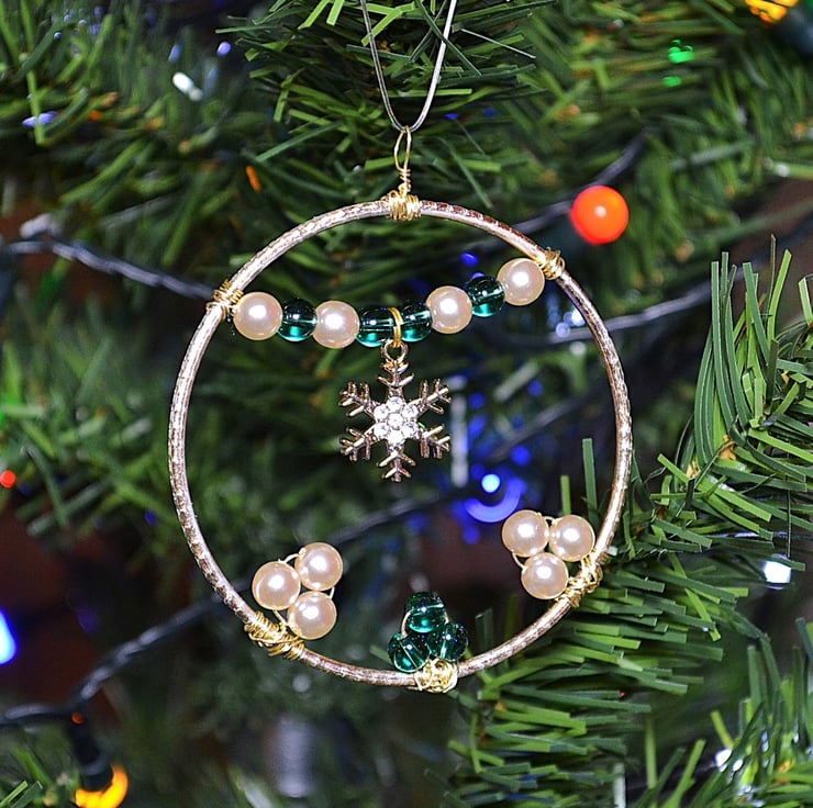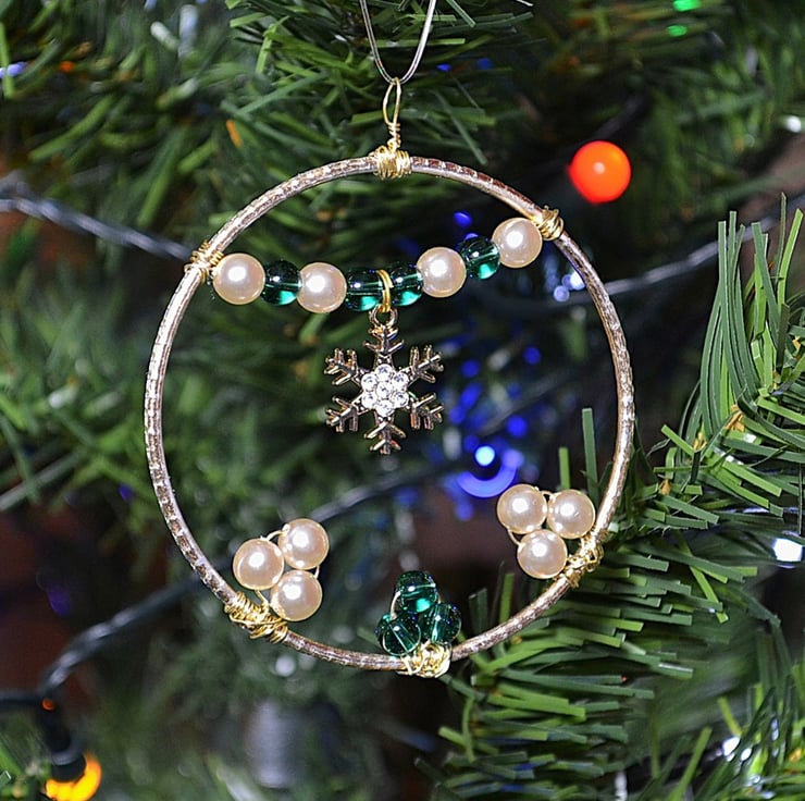 This cute Christmas tree decoration features a row of glass pearl and green glass beads, with a sparkly gold-plated snowflake, and groups of three glass pearls and green beads twisted and wire wrapped to the upcycled bangle frame.